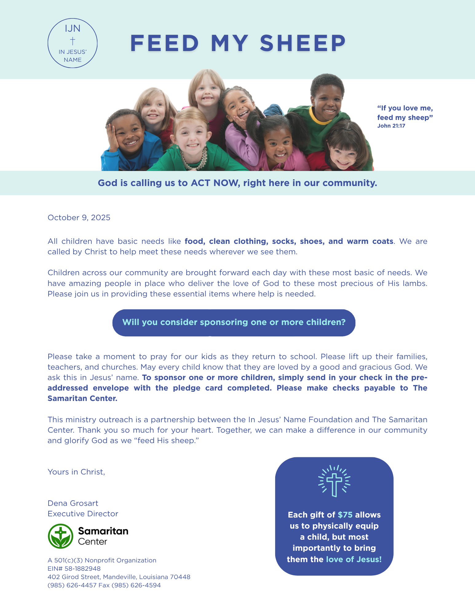 Thank you so much for your heart. Together, we can make a difference in our community and glorify God as we “feed His sheep.”